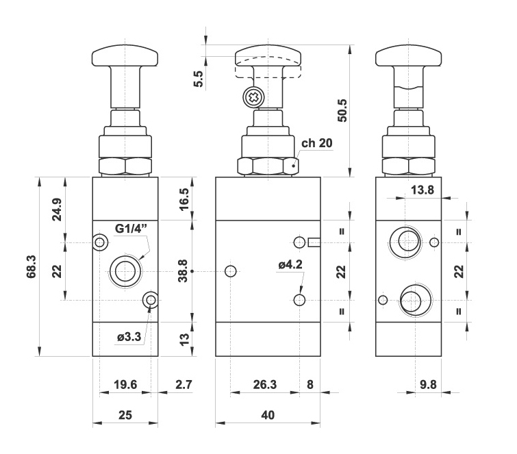 Начало / Пневматика / Разпределители / Разпределител 322 TT, 3/2, 1/4"