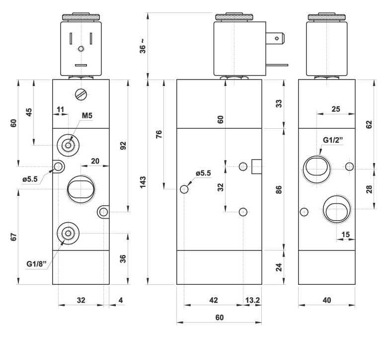 Номинален диаметър (DN): 13 mm Номинален дебит при 6 bar (QN): 4600 Nl/min Работна температура: max + 60°C Работно налягане: 2.5 ... 10 bar Време за превключване: TRA (14): 39 ms / TRR (12): 60 ms Работен флуид: 50 µm филтриран, омаслен или неомаслен въздух