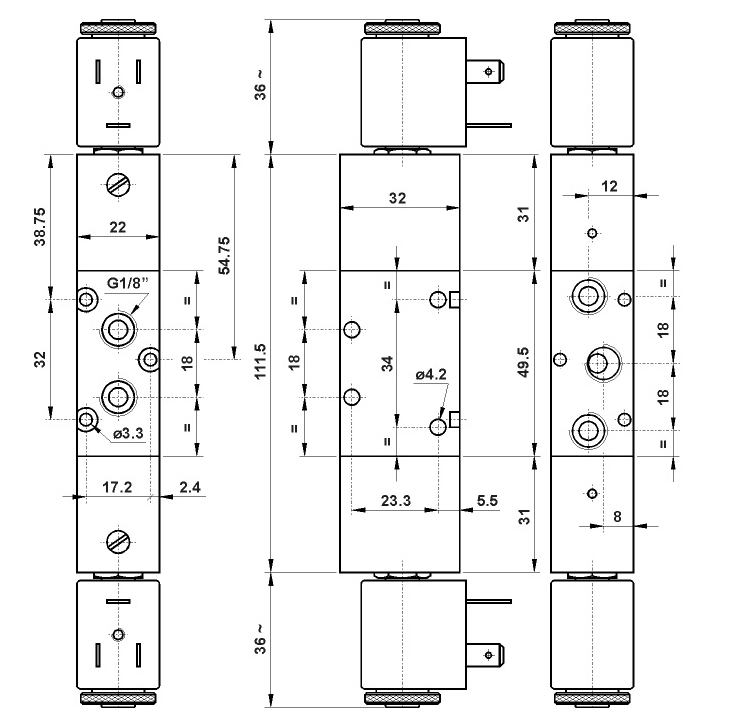 Номинален диаметър (DN): 5 mm Номинален дебит при 6 bar (QN): 550 Nl/min Работна температура: max + 60°C Работно налягане: 1 ... 10 bar Време за превключване: TRA (14): 20 ms / TRR (12): 20 ms Работен флуид: 50 µm филтриран, омаслен или неомаслен въздух