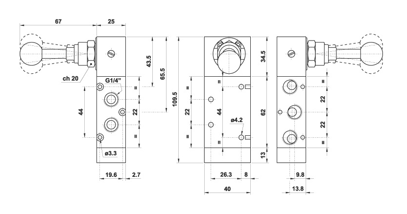 Начало / Пневматика / Разпределители / Разпределител 5223A LL90, 5/3, 1/4"