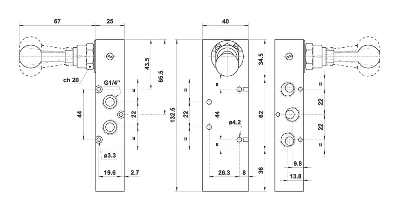 Начало / Пневматика / Разпределители / Разпределител 5223P ML90, 5/3, 1/4"
